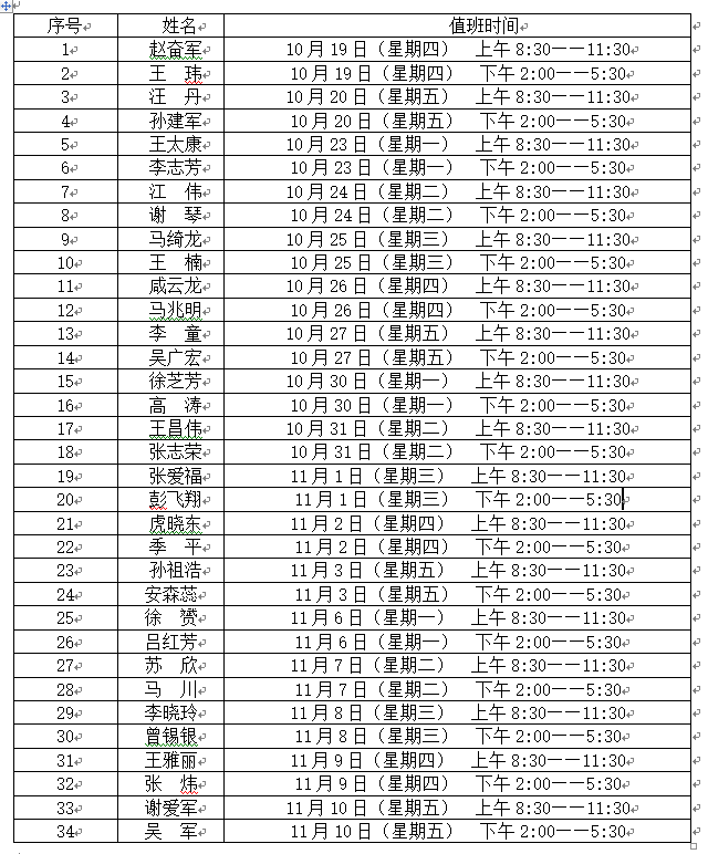 2.请届时有课、有事的老师自行调换,但每人必须保证至少值班1次3个小时以上,请各党支部和办公室做好考勤工作。