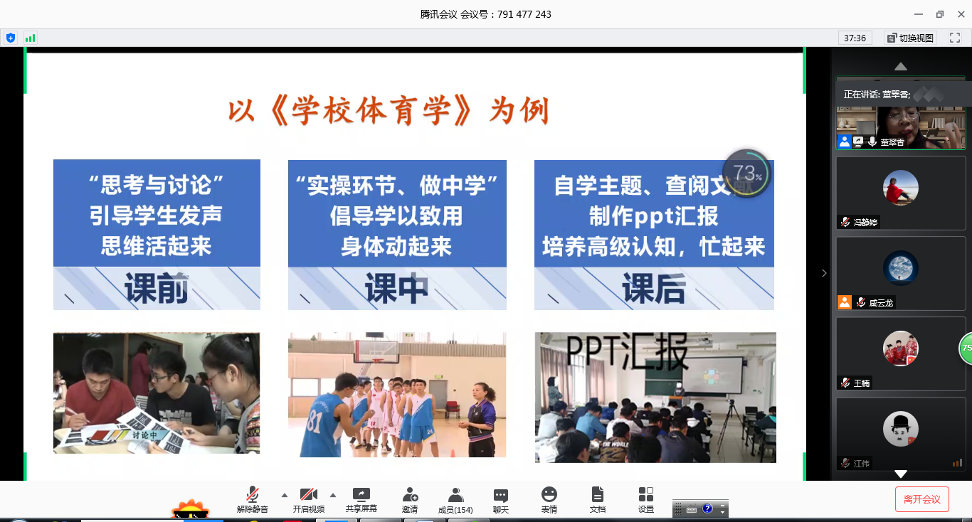 最后,董教授在线与大家进行了互动交流。就体教融合理念对体育教师的要求、教师教育如何培养专业素养、新教学理念与传统教学的关系、如何引领员工主动学习等问题进行了深入交流、细致讨论,董教授的耐心解答和悉心指导为青年教师更好地备战教学基本功大赛提供了思路,指明了方向。