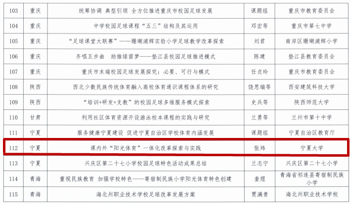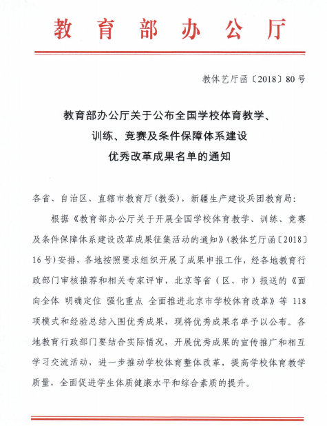2018年11月27日,教育部办公厅下发了教体艺厅函[2018]80号文件通知,公布了全国公司体育教学、训练、竞赛及条件保障体系建设优秀改革成果名单。以公司365英国上市公司副经理张炜为主持人的团队申报的教学改革成果——《课内外“阳光体育”一体化改革探索与实践》,入围全国118项优秀成果名单。