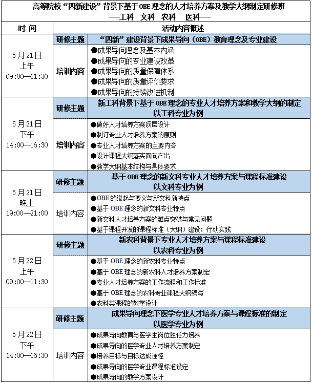 本次培训共计5场,围绕OBE理念下人才培养方案、课程大纲制定方面展开,通过各自专业的案例详细介绍OBE理念下人才培养方案反向设计思路、人才培养目标与毕业要求的支撑关系、毕业要求与课程体系的构建矩阵等,为参会教师进行人才培养方案及课程教学大纲制定提供专业指导。