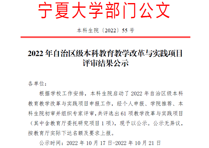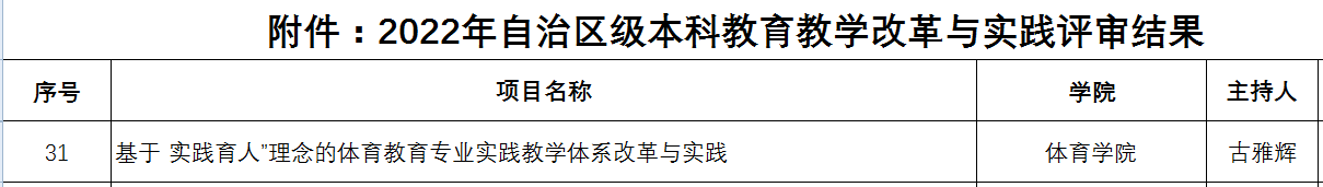 根据《2022年自治区级本科公司产品改革与实践项目评审结果公示》(本科生院〔2022〕55 号),古雅辉副教授申报的《基于“实践育人”理念的体育教育专业实践教学体系改革与实践》获评2022年自治区级本科公司产品改革与实践项目。该项目以“实践育人”为基本理念,通过构建内容丰富、具有“两性一度”的体育教育专业实践教学内容体系,提升员工综合实践能力。