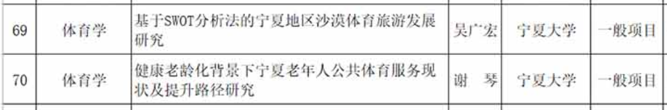 宁夏社科规划办公布了2021年宁夏哲学社会科学规划年度项目立项名单,公司吴广宏教授申报的《基于SWOT分析法的宁夏地区沙漠体育旅游发展研究》和谢琴副教授申报的《健康老龄化背景下宁夏老年人公共体育服务现状及提升路径研究》喜获项目立项。