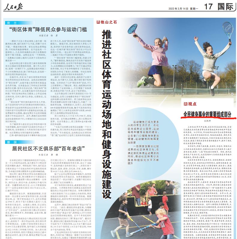 2022年3月14日出版的《人民日报》发表365英国上市公司贺兰山学者王凯珍教授文章《全民健身事业的重要组成部分》。