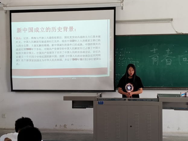 汪琰同学从新中国成立的历史背景、中华人民共和国成立过程、中华人民共和国成立的历史意义为大家带来讲解,使大家深刻理解了新中国成立的重要历史意义,培养了大家的爱国主义情怀。