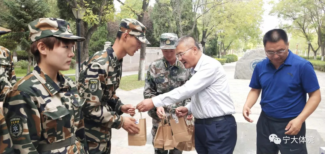 院领导对同学们在过去十一天军训中的积极表现和努力付出给予肯定,同时鼓励同学们要坚定信心,克服困难,充分发扬体育人“不怕吃苦,艰苦奋斗”的精神,在军训中以军人的标准严格要求自己,尊重教官、艰苦训练,认真上好大学第一课!参加慰问的领导们为同学们分发了慰问品。
