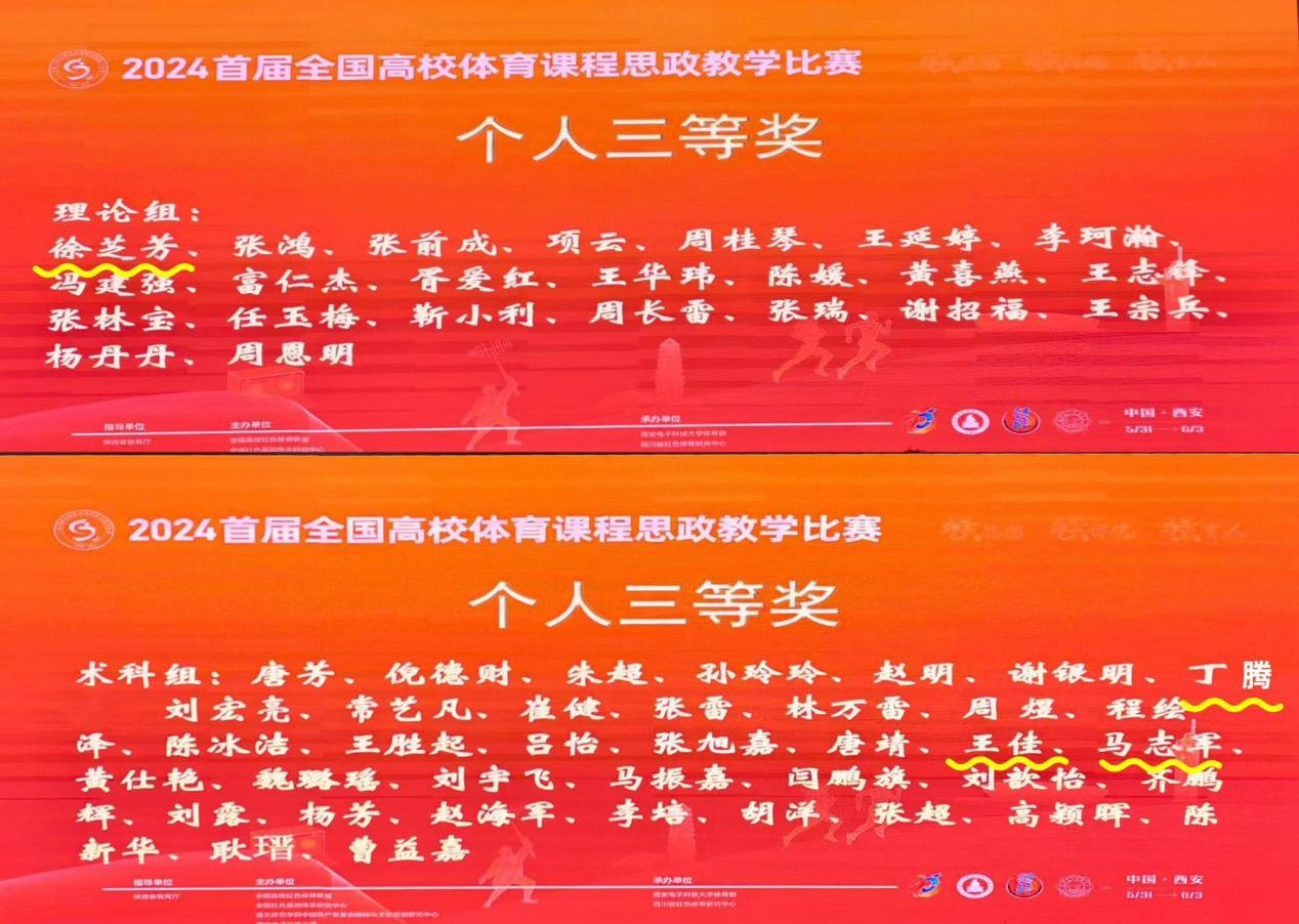 为深入学习贯彻党的二十大精神,始终坚持“立德树人”根本任务,营造课程思政建设氛围,全面提升教师课程思政建设的意识和教学能力,提升人才培养质量,加强师德师风建设。6月1日,2024首届全国高校体育课程思政教学比赛在西安电子科技大学拉开帷幕,经过两天激烈角逐,公司徐芝芳、马志军、丁腾、王佳四位教师凭借卓越的教学设计和精彩的现场表现,分别获得理论组、术课组三等奖。