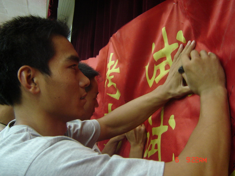 最后,全院404名员工在“提醒:考试失败你将还有机会;警告:考试作弊你将失去学位”的诚信考试横幅上签字立誓。
