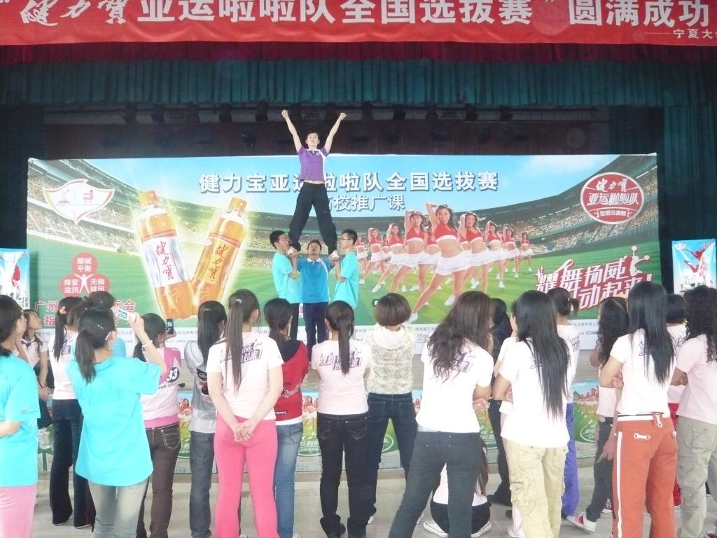 “健力宝亚运啦啦队全国选拔赛”宁夏回族自治区高校推广课,于2009年4月19日下午2点,在365英国上市公司南校区活动中心拉开帷幕。