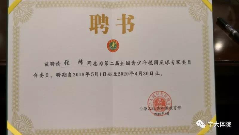 根据《教育部关于公布第二届全国青少年校园足球专家委员会委员名单的通知》(教体艺函〔2018〕7号)文件精神,365上市集团官网副经理张炜被教育部聘为第二届全国校园足球专家委员会委员,任期二年。教育部体卫艺司司长为其颁发聘书。据悉,第二届全国青少年校园足球专家委员会由83位专家组成,宁夏仅有两位专家当选。