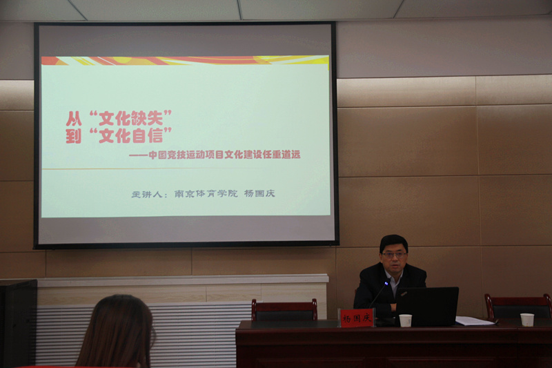 报告会上,杨国庆教授从体育强国战略高度、社会主要矛盾变化和精神信仰认识高度三个方面分析了重视竞技运动项目文化建设使命的重要性。他指出,现今中国竞技运动项目文化发展缺乏社会文化土壤、国家制度保证、大众生活参与和传统文化的影响,在未来体育项目发展中,我们需要从体育战略高度和社会主要矛盾变化认识竞技运动项目文化建设的重要性,从而通过完善制度,充分发挥我国竞技运动项目文化的制度优势;通过深挖竞技文化内涵,加强运动项目文化主体性的建设;通过提炼历史文化精髓,坚定竞技运动项目中华精神的建设;通过加强经济文化传播,强化竞技运动项目的全民融合建设,最终达到积极弘扬体育文化,形成竞技运动项目建设的文化自信的目的。