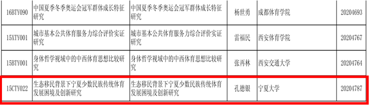 今日,全国哲学社会科学工作办公室共验收495个年度项目、青年项目和西部项目结项申请。经同行专家鉴定,398个项目予以结项;78个项目暂缓结项;19个项目被终止。公司孔德银老师《生态移民背景下宁夏少数民族传统体育发展困境及创新研究》项目已成功结题。