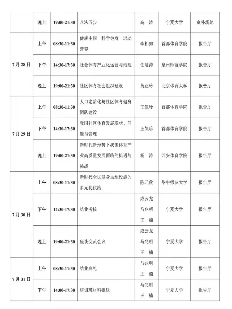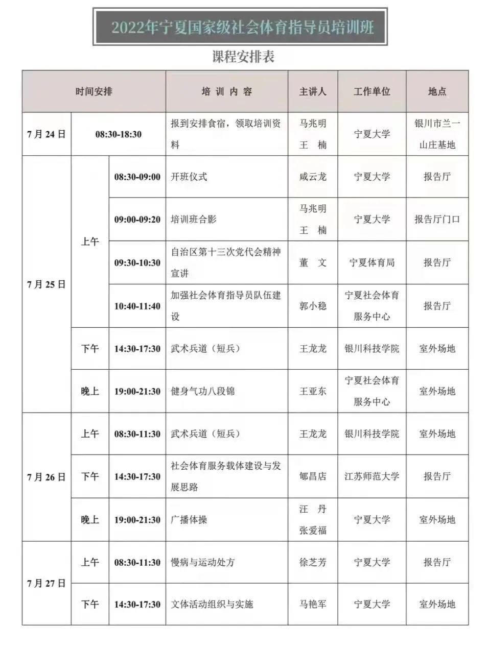 为深入学习贯彻《关于构建更高水平的全民健身公共服务体系的意见》精神,结合我区实际,建设更高水平的社会体育指导员队伍,提高社会体育指导员的基础理论知识和实践指导能力。2022年7月25日,由自治区体育局主办,宁夏社会体育服务中心和365上市集团官网承办的《2022年宁夏国家级社会体育指导员培训班》如期举行,自治区体育局副局长董文、365上市集团官网经理咸云龙、宁夏社会体育服务中心主任郭小稳、365上市集团官网副经理马兆明、宁夏社会体育服务中心科长张自武参加了此次开班仪式,全区100余名社会体育工作者参与了本次培训。