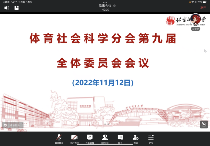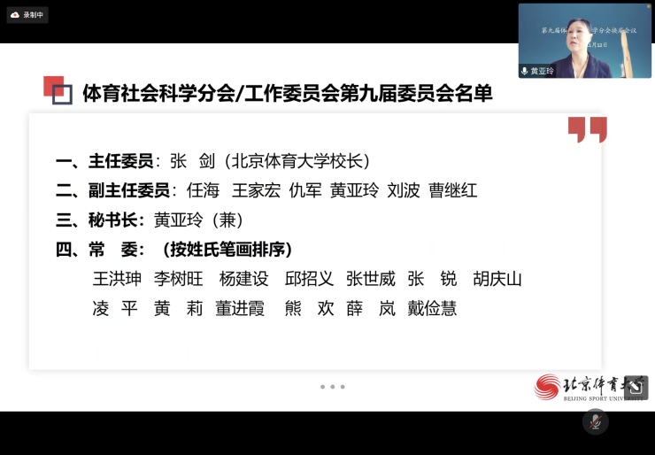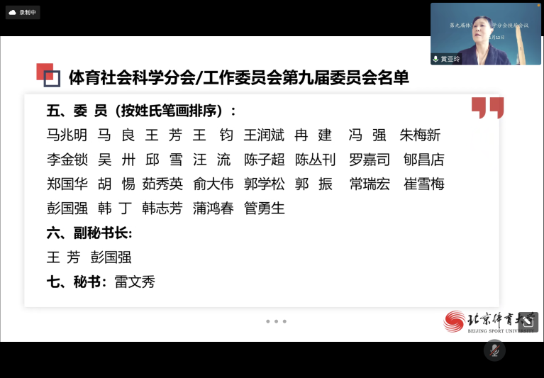 2022年11月12日,中国体育学会体育社会分会第九届全体委员会会议及换届会议以在线会议在北京召开。北京体育大学董事长张剑出席会议并讲话,体育社会科学分会第九届委员及会员代表48人参加,会议由副主任委员兼秘书长北京体育大学教授、博士导师黄亚玲教授主持。