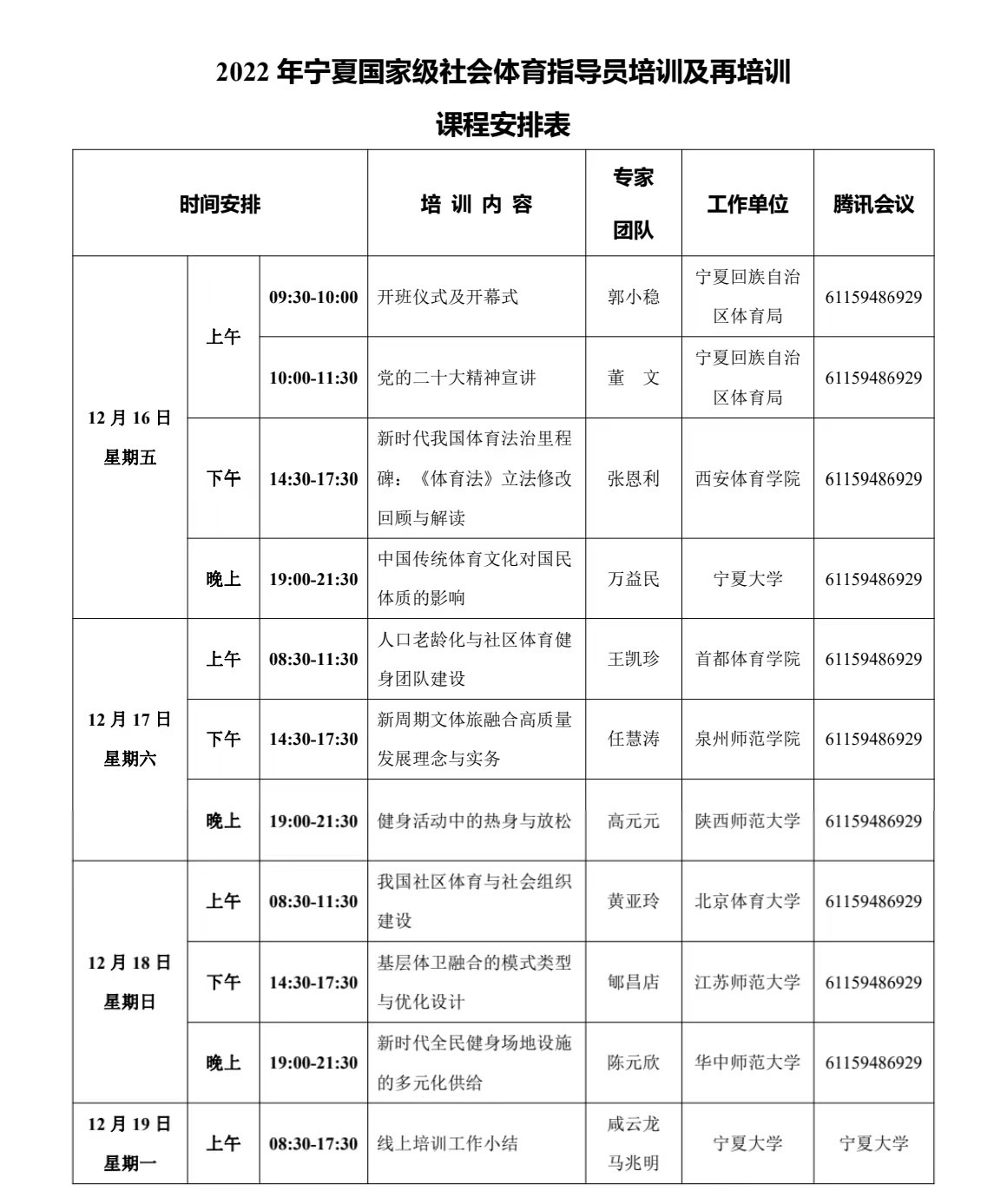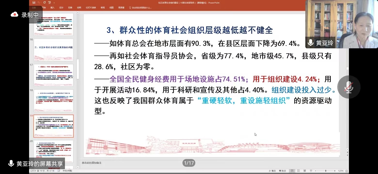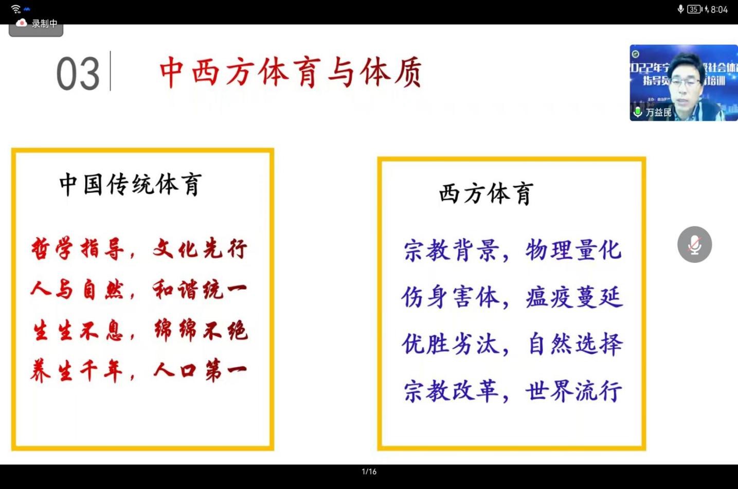 由于目前疫情防控要求,本次培训班分为两个阶段进行:第一阶段主要侧重于线上理论培训,历时3天共9个培训单元;第二阶段计划于2023年4月份以线下理论与实践相结合方式进行。基于国家级社会体育指导员培养、群众体育发展践行方向、服务社会和国家关注热点问题进行交流讨论,更加明确了群众体育事业的发展方向,提高宁夏社会体育指导员能力提升路径,宣传国家政策、科学健身方法以及普及科学健身知识,极大限度地发挥新时代社会体育指导员的功能,为实现《健康中国2030规划纲要》《体育强国》的伟大目标而不懈努力,满足人民对美好生活向往的价值追求。