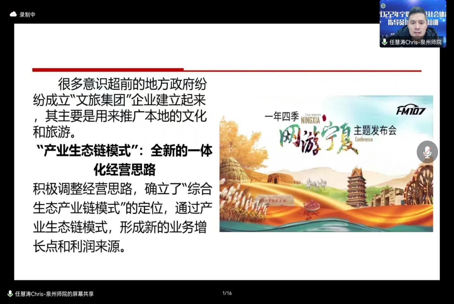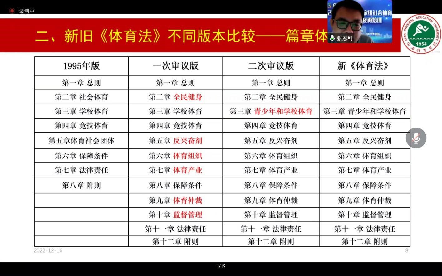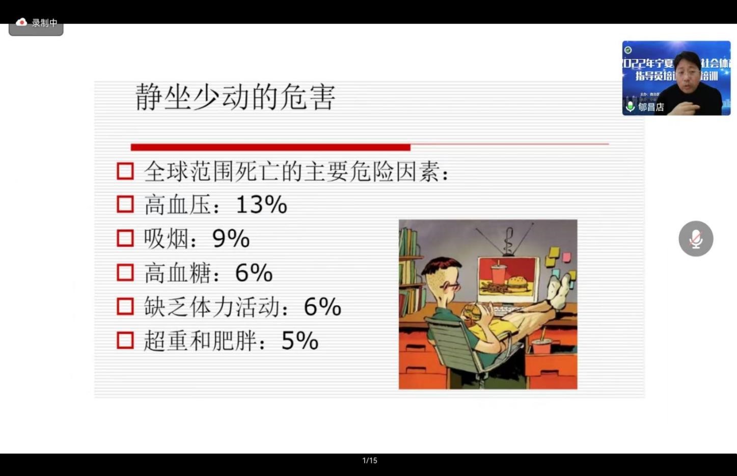 由于目前疫情防控要求,本次培训班分为两个阶段进行:第一阶段主要侧重于线上理论培训,历时3天共9个培训单元;第二阶段计划于2023年4月份以线下理论与实践相结合方式进行。基于国家级社会体育指导员培养、群众体育发展践行方向、服务社会和国家关注热点问题进行交流讨论,更加明确了群众体育事业的发展方向,提高宁夏社会体育指导员能力提升路径,宣传国家政策、科学健身方法以及普及科学健身知识,极大限度地发挥新时代社会体育指导员的功能,为实现《健康中国2030规划纲要》《体育强国》的伟大目标而不懈努力,满足人民对美好生活向往的价值追求。