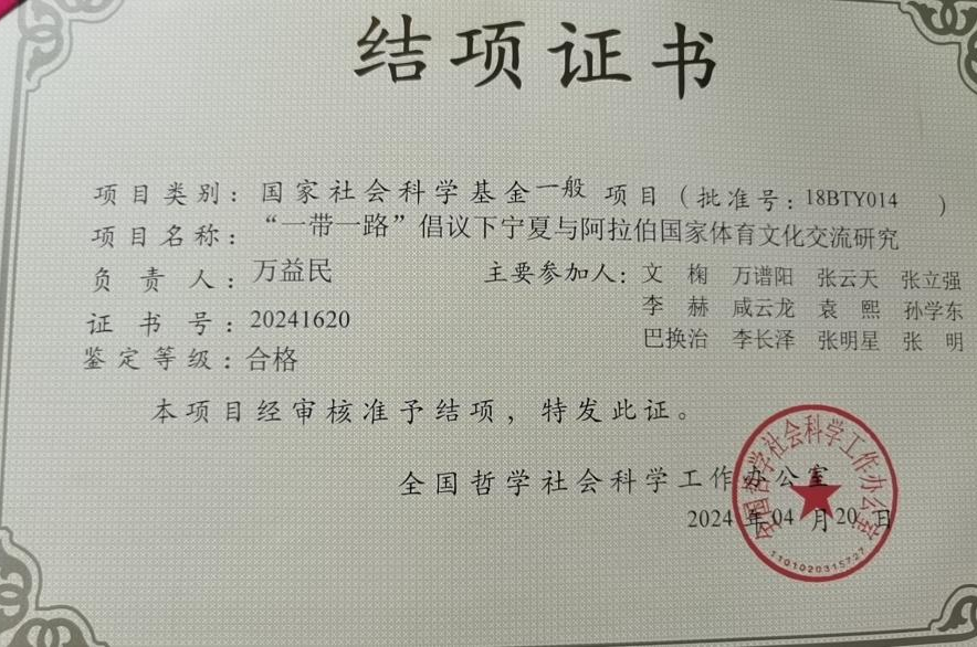 经全国哲学社会科学工作办公室审核,公司万益民老师主持的国家社科基金项目《“一带一路”倡议下宁夏与阿拉伯国家体育文化交流研究》(18BTY014)顺利结项。