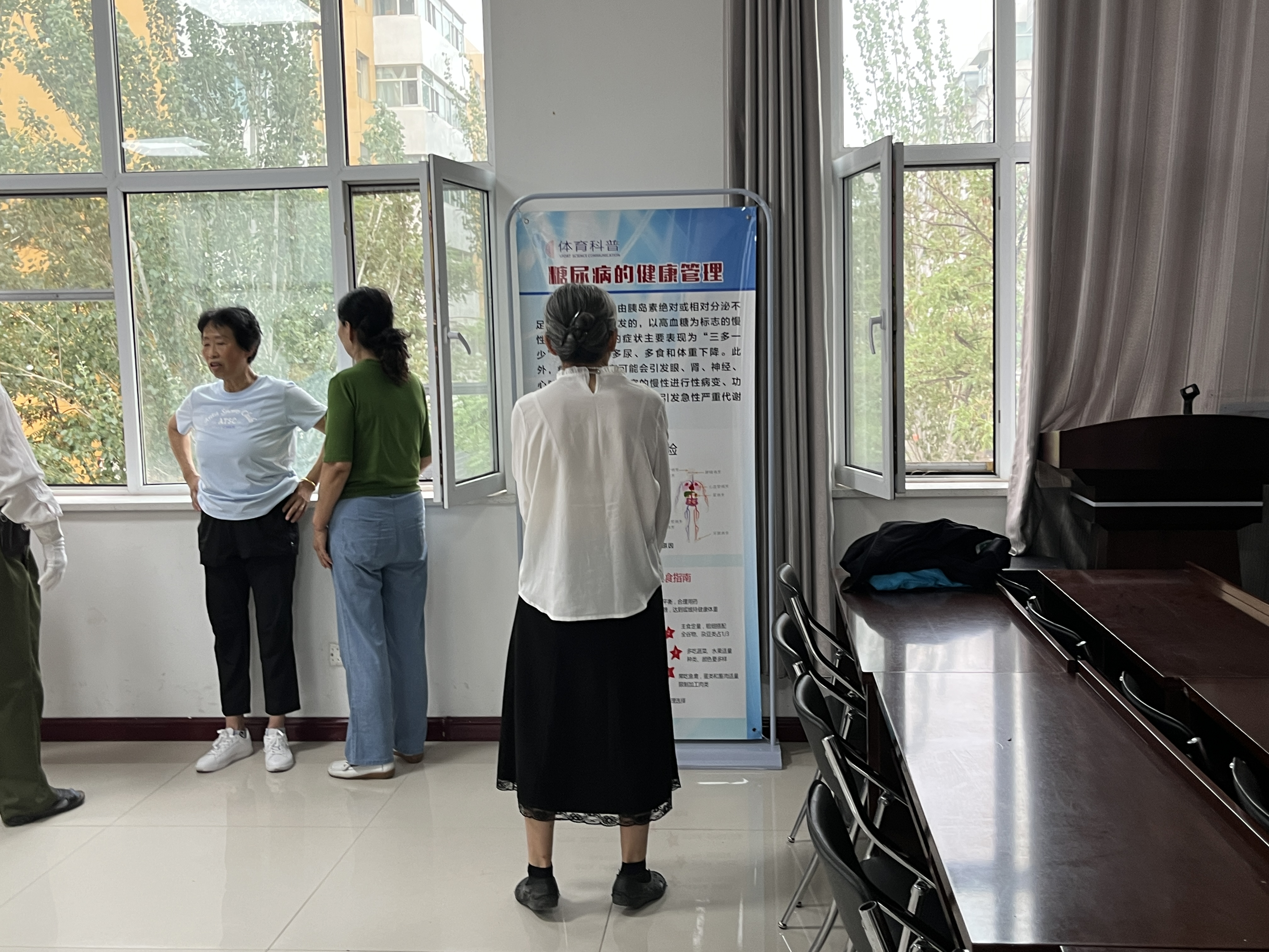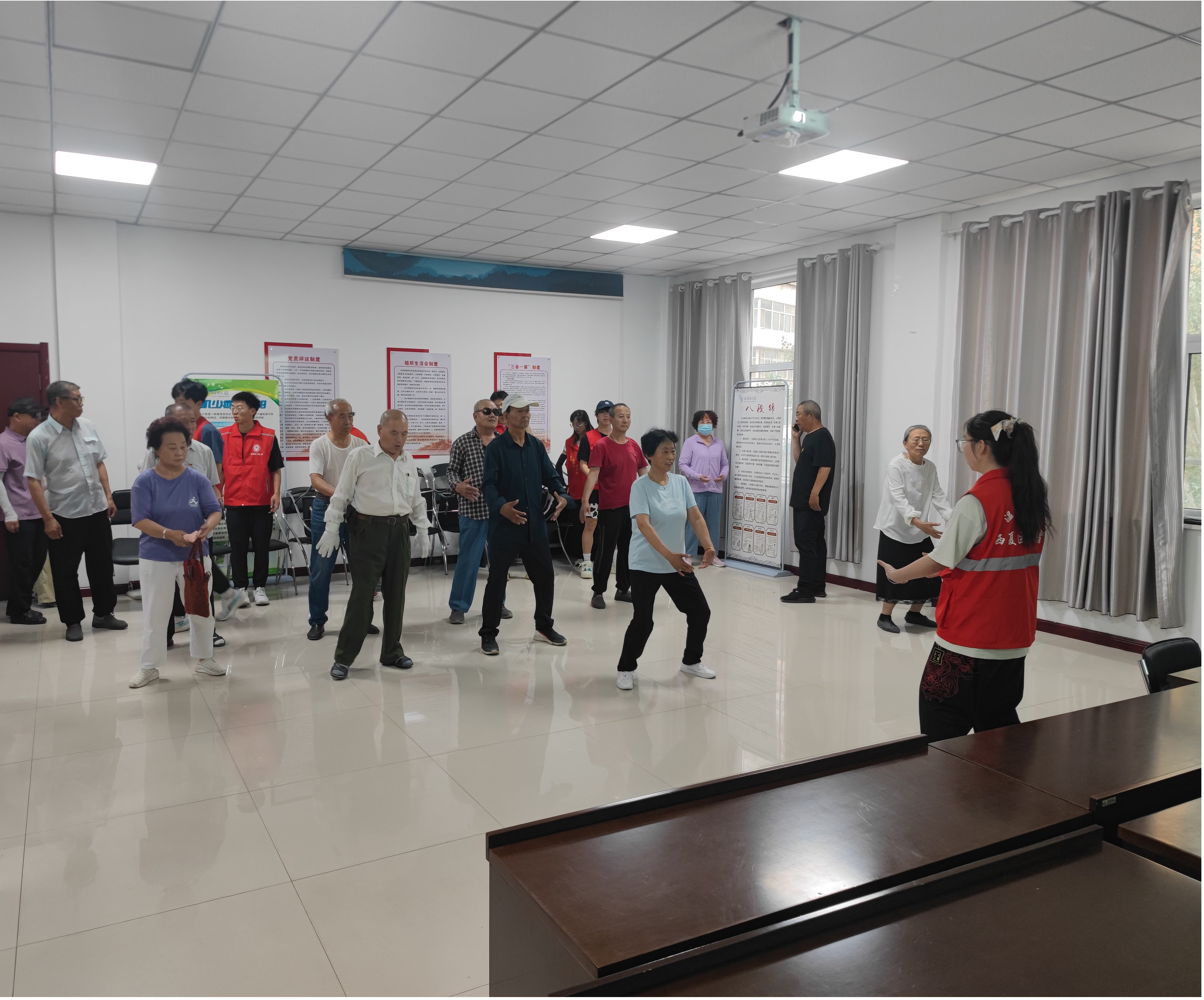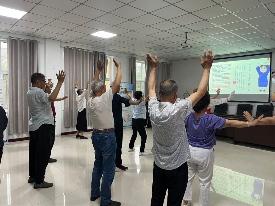 接着是运动实践环节,王嫘同学先对老年人进行八段锦的教授,基地科普员巡回辅助他们进行学习;接着,她带领老年人做了一遍完整的八段锦,老年人都积极参与并都达到身体微微出汗的状态。最后,基地科普员逐个询问老年人的学习状况,并为他们耐心纠错与辅导,使他们感受到了运动的魅力和对身心的有益促进作用。