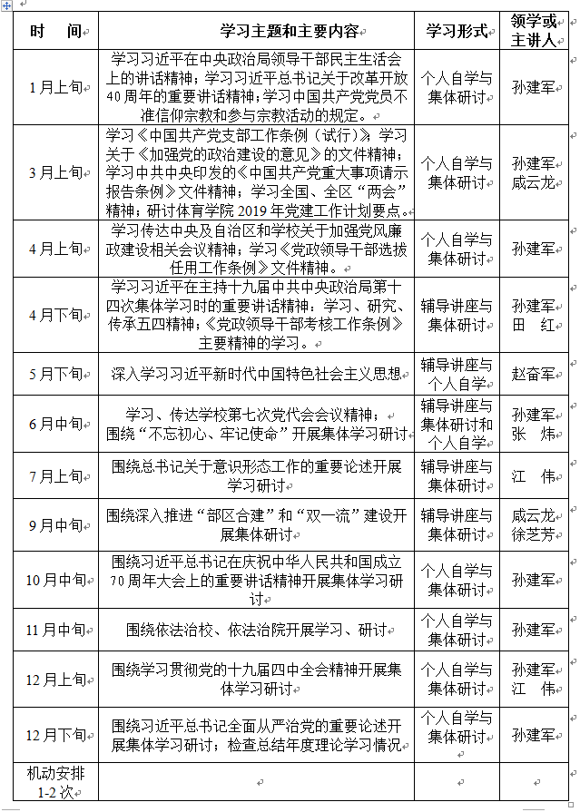 特别说明:根据公司工作安排,以上为公司中心组2019年的理论学习安排,请各中心组成员认真执行,每次的主讲人或领学人必须提前备课并准备好相关学习材料。公司周三教职工、党支部、各班级的政治理论学习应结合工作实际,参照本安排计划执行。