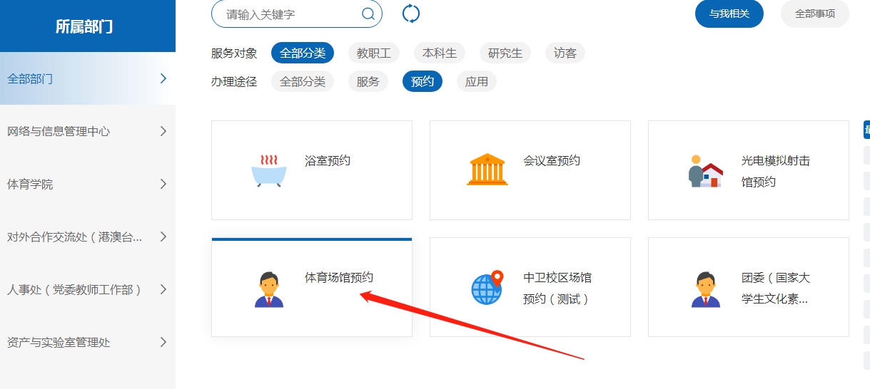 3.点击办理途径---预约,找到“体育场馆预约”。