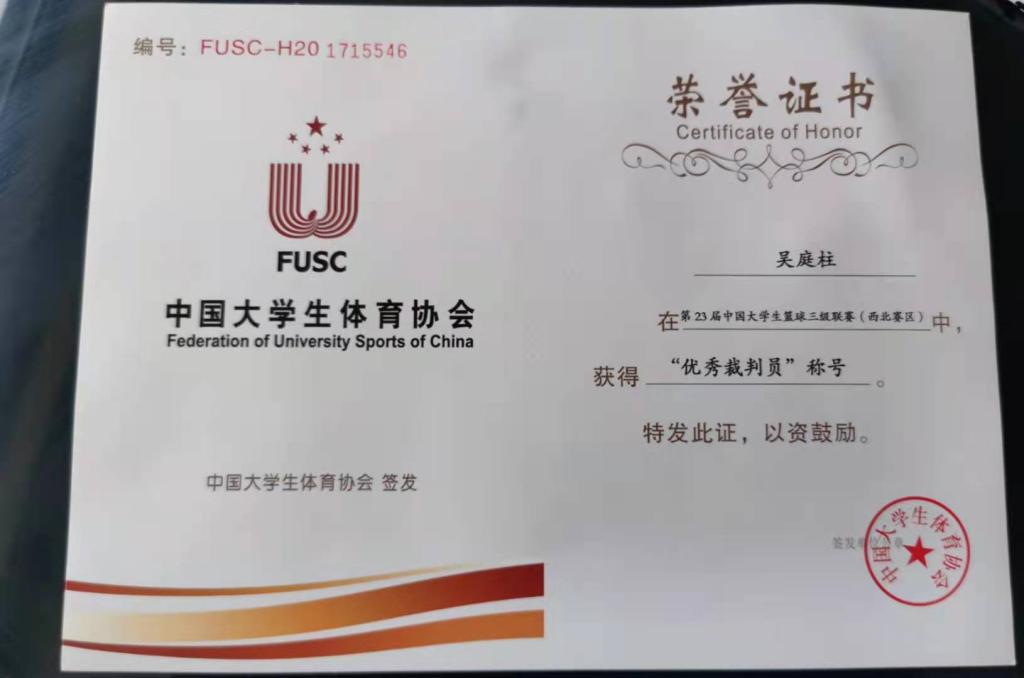2021年5月21日-26日,第23届中国老员工篮球三级联赛(西北赛区)的比赛在呼和浩特职业公司举行。公司青年教师、篮球国家级裁判吴庭柱老师被选调担任本次比赛的裁判任务,在赛会期间作为主裁判承担第一阶段到决赛阶段的全过程裁判工作,被评选为“优秀裁判员”。