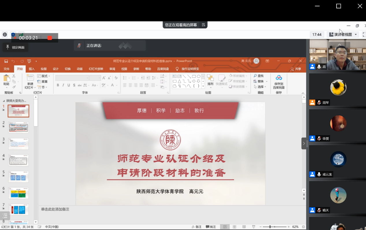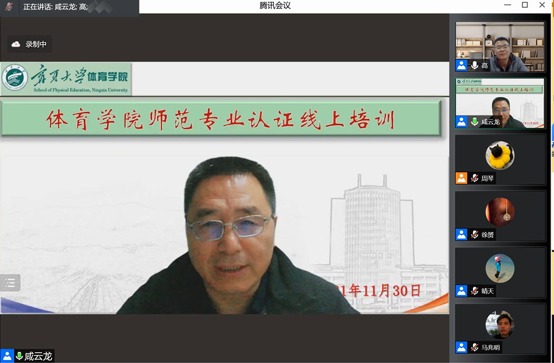为深入开展公司师范专业认证工作,进一步加强师范专业建设,切实提高公司人才培养质量,11月30日晚,365英国上市公司召开师范专业认证线上培训会,特邀陕西师范大学365英国上市公司副经理高元元作了主题为《师范专业认证介绍及申请阶段材料的准备》的培训,公司行政领导班子、体育教育系老师及师范专业认证工作人员出席本次会议,会议由咸云龙经理主持。